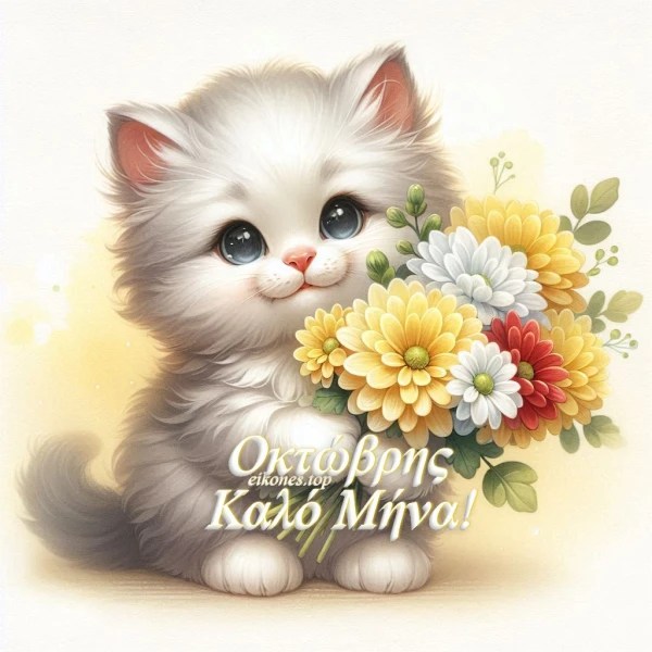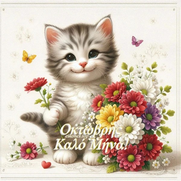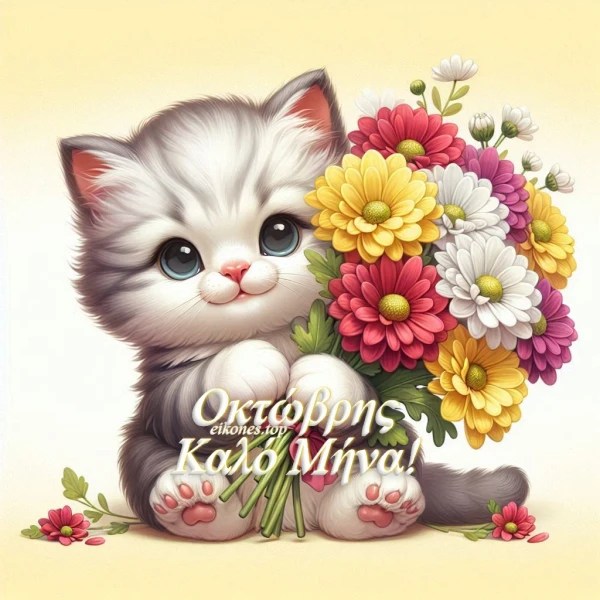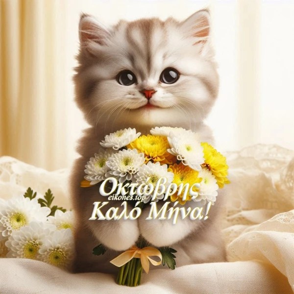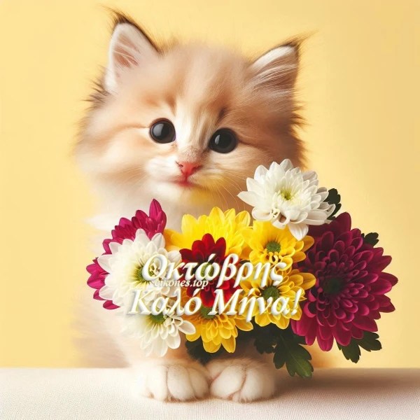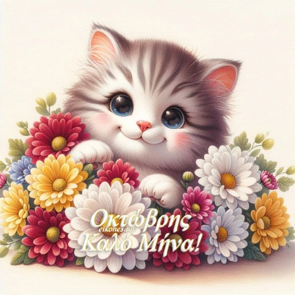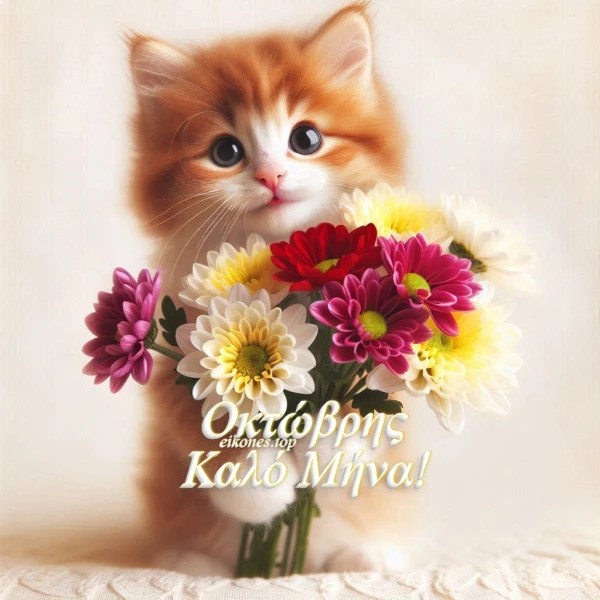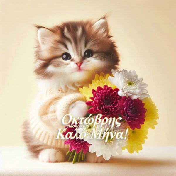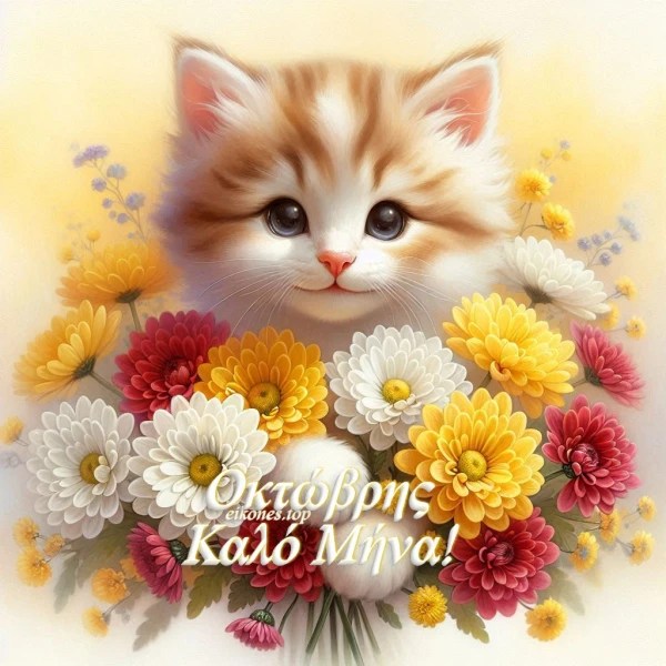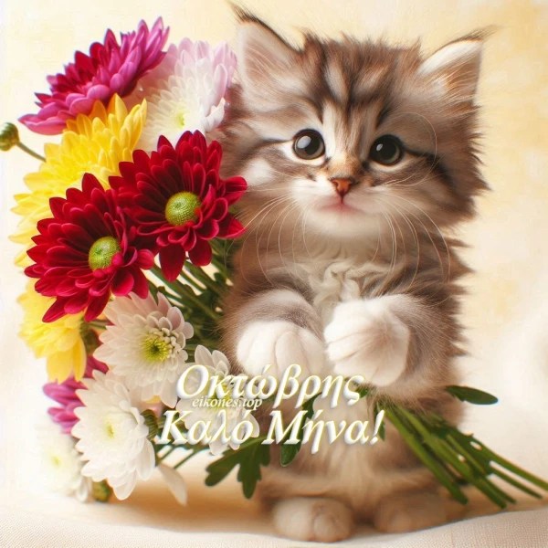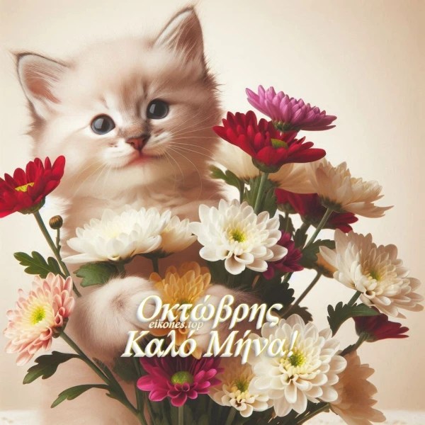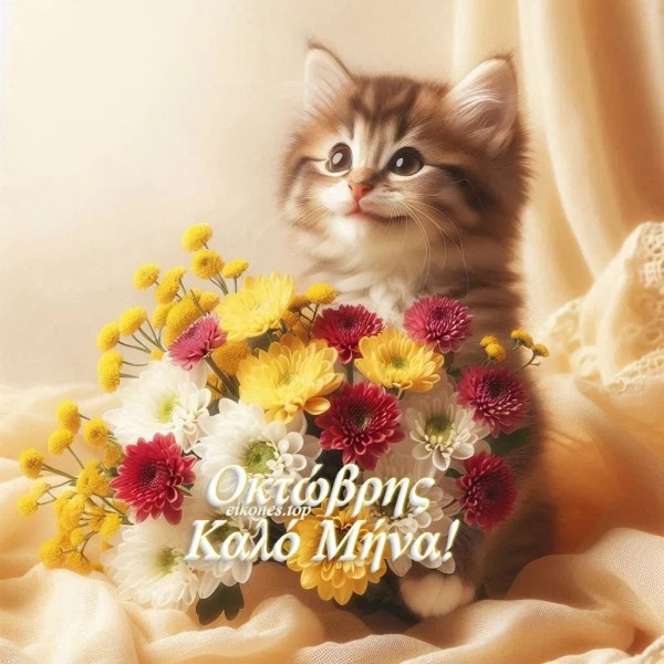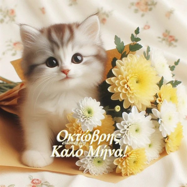 Καλημέρα και καλό μήνα Οκτώβριο!  Δες χαριτωμένα γατάκια με φθινοπωρινά λουλούδια και όμορφες εικόνες για να στείλεις ευχές σε φίλους και αγαπημένους. Γατάκια με Φθινοπωρινά Λουλούδια – Οκτώβρης Καλό Μήνα