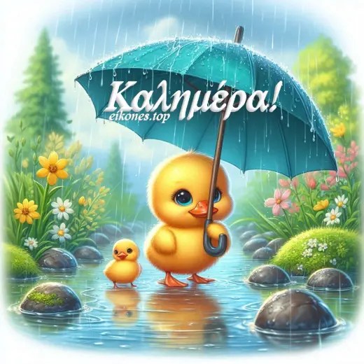 Καλημέρα ,παπάκι στη βροχή να κρατάει ομπρέλα
